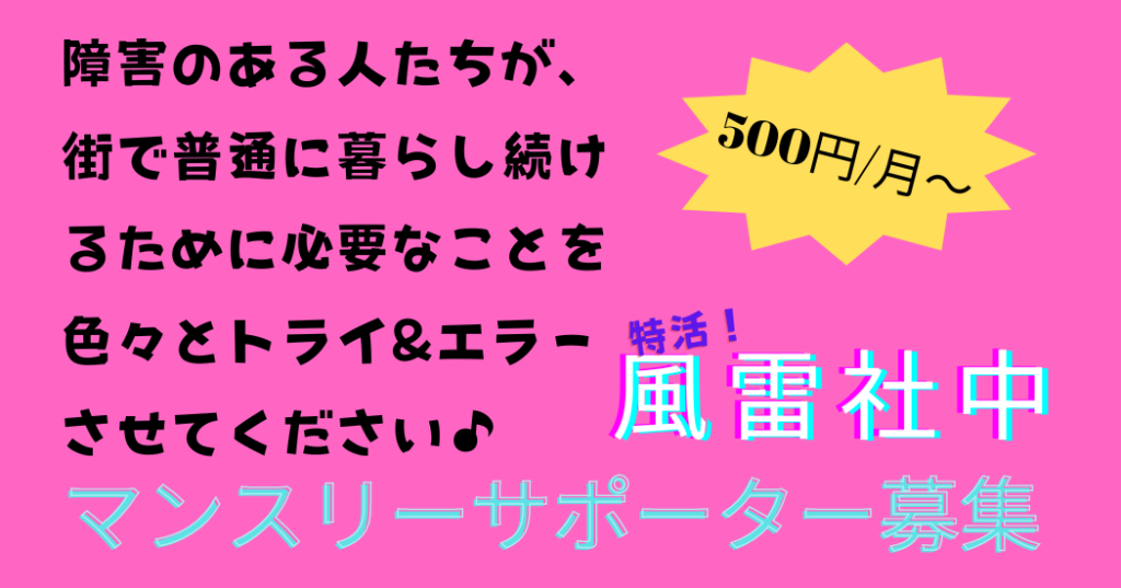 障害のある人が当たり前に地域で暮らしていくことを実現して、障害のある人への差別を解消していくための風雷社中のアクションに、ぜひ参加して下さい。
